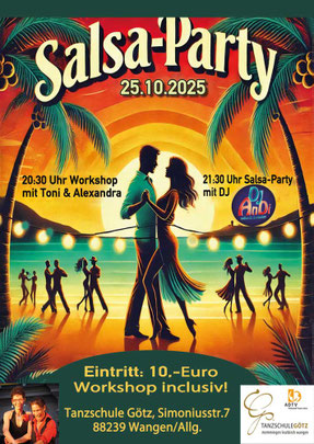 Zu Beginn gibt es den Salsa-Workshop mit Toni und Alexandra, die euch wieder eine super tolle Figur vermitteln werden.